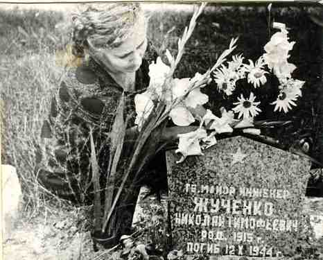 Николай Тимофеевич Жученконың әйелі Рига қаласын азат ету кезінде қайтыс болған күйеуінің қабірінде. 1975 ж.