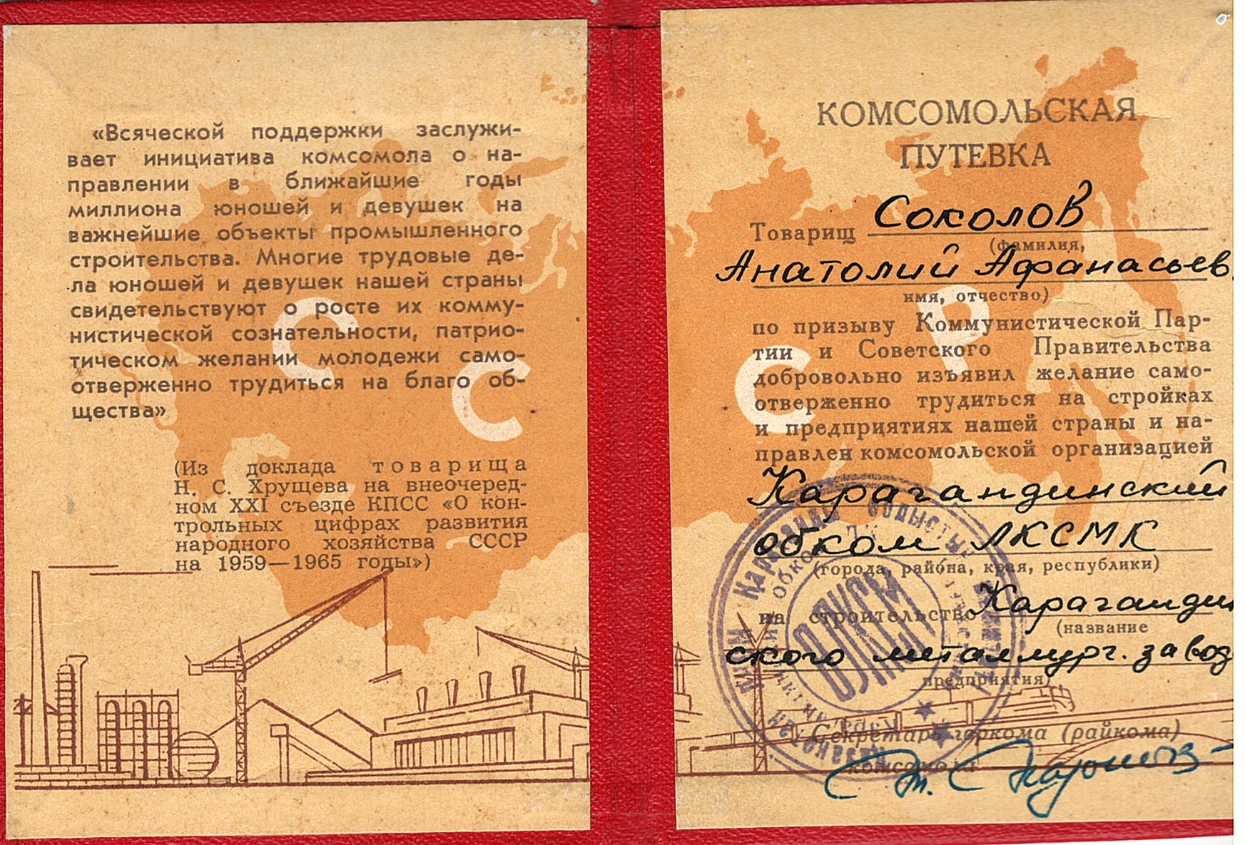 1958 жылдың сәуірінде БЛКЖО XIII съезі Қазақстан Магниткасын елдің Бүкілодақтық соққы комсомол құрылысы деп жариялады. Мыңдаған жігіттер мен қыздар Қазақстанның жаңа құрылысына жолдама алу үшін комсомол комитеттеріне келді. 1958-1959 жылдары БЛКЖО ОК Қазақстан Магниткасының құрылысына 26 мың ерікті жіберді. Тек 1958 жылдың өзінде «Қазметаллургстрой» трестіне қоғамдық шақыру бойынша 6029 ерікті келді. Зауыт құрылысы үшін 23 миллион текше метр топырақты қайта өңдеу, 2,5 миллион текше метр бетон төсеу, 210 мың тонна металл конструкцияларын, 314 мың тонна технологиялық жабдықты монтаждау қажет болды.