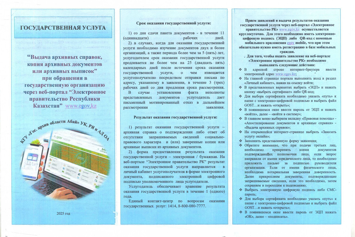 Памятка по получению государственной услуги «Выдача архивных справок, копий архивных документов или архивных выписок» через веб-портал «Электронное правительство РК» www.egov.kz