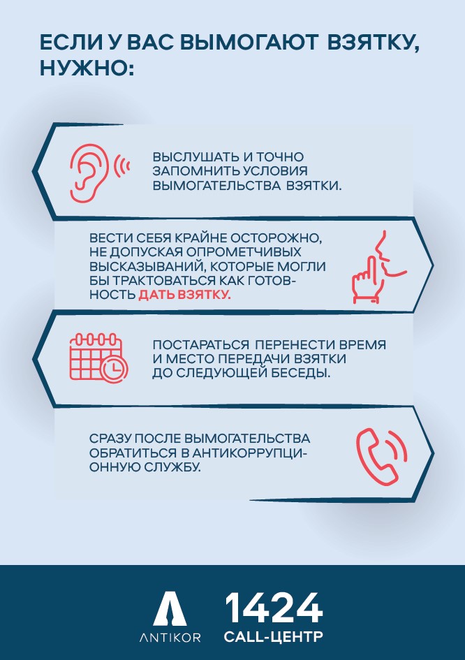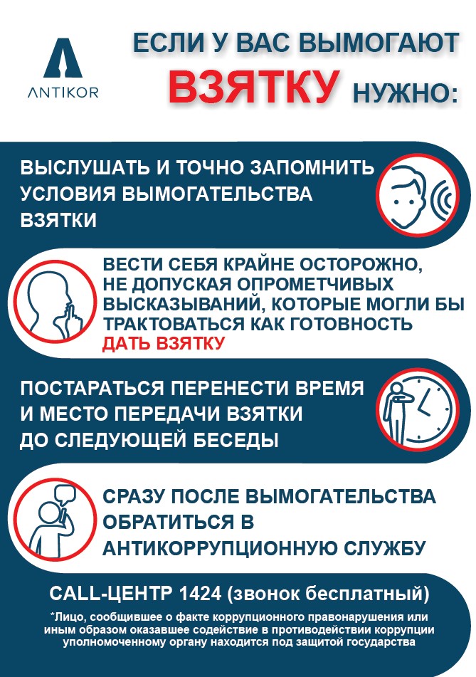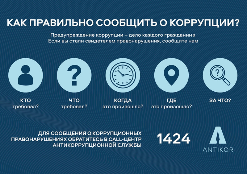 В случае столкновения с нарушениями коррупционного характера, вы можете обратиться в call-центр Антикоррупционной службы – 1424 (звонок бесплатный).