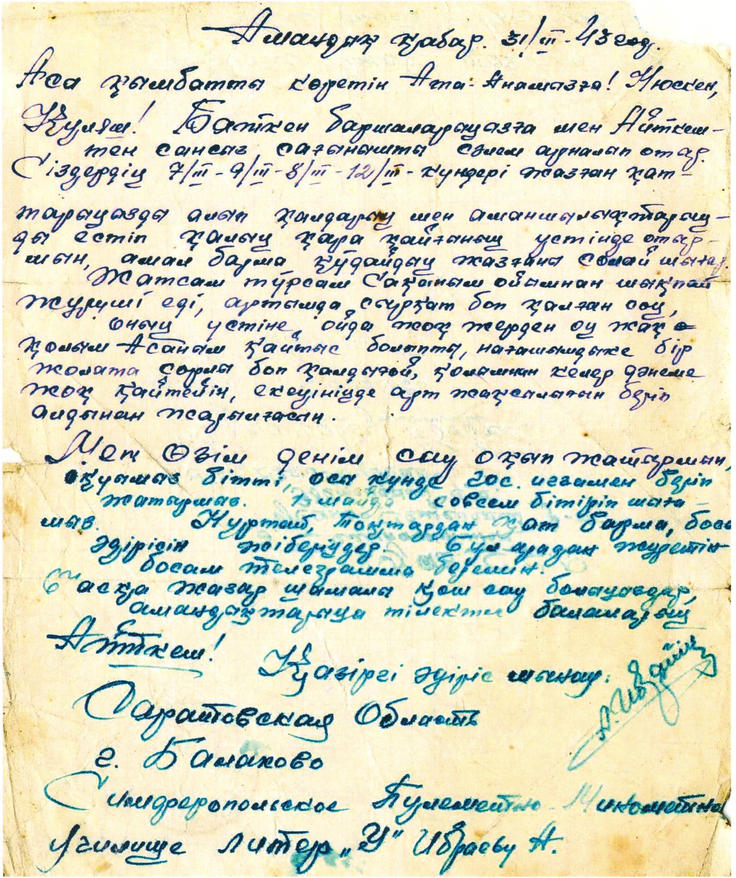Әскери училищеден А.Ибраевтің хаты. 31 наурыз 1943 ж / Письмо А. Ибраева из военного училища. 31 марта 1943 г.
