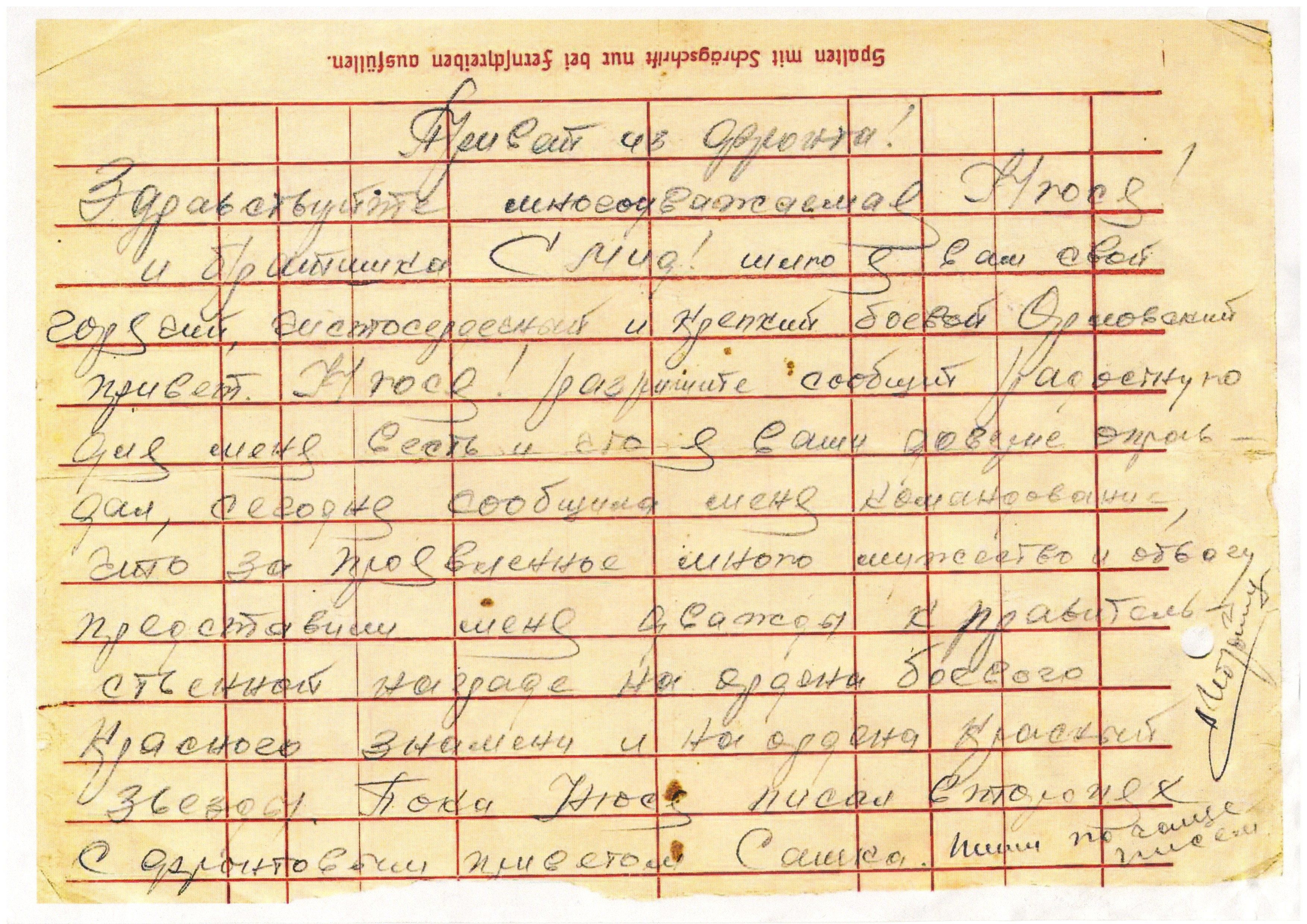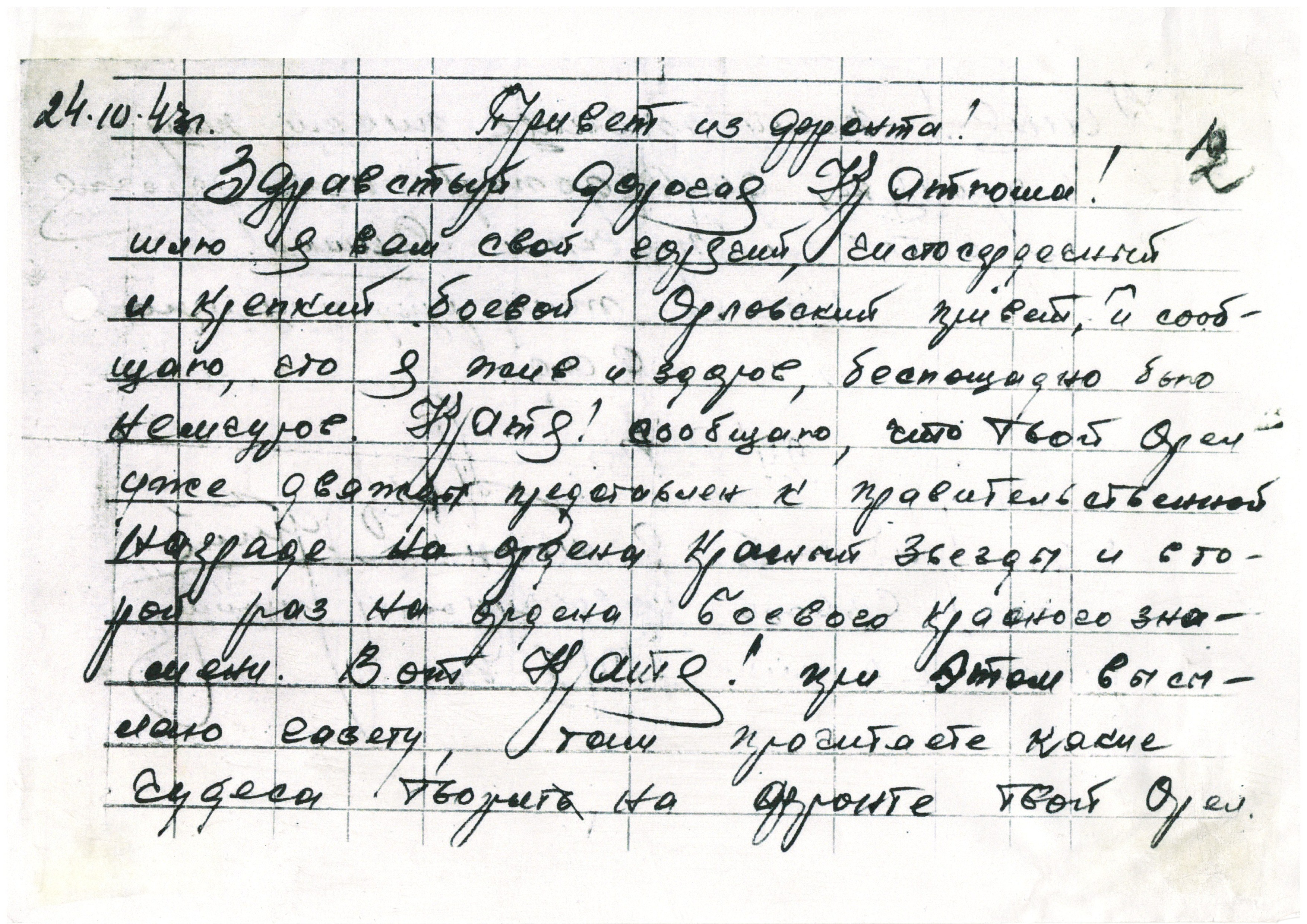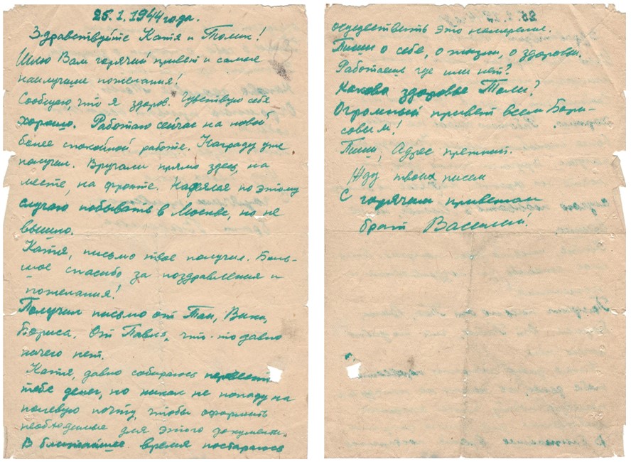 Қызыл Армия жауынгері Василийдің марапаты туралы хаты. / Письмо с известием о награде красноармейца Василия.