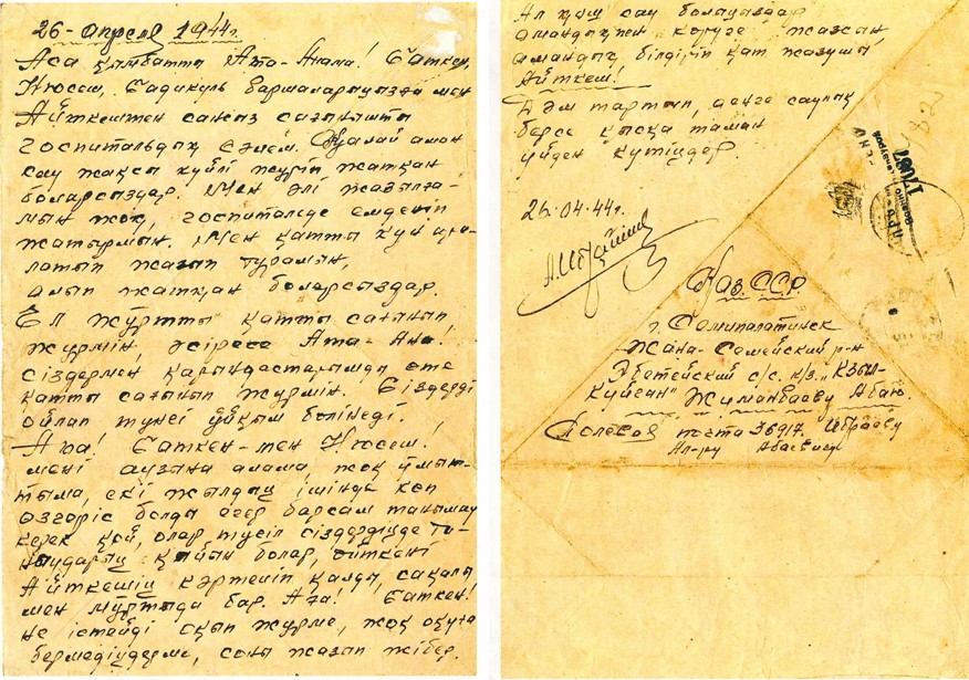 А. Ибраевтің госпитальдан жазған хаты / Письмо А. Ибраева из госпиталя.