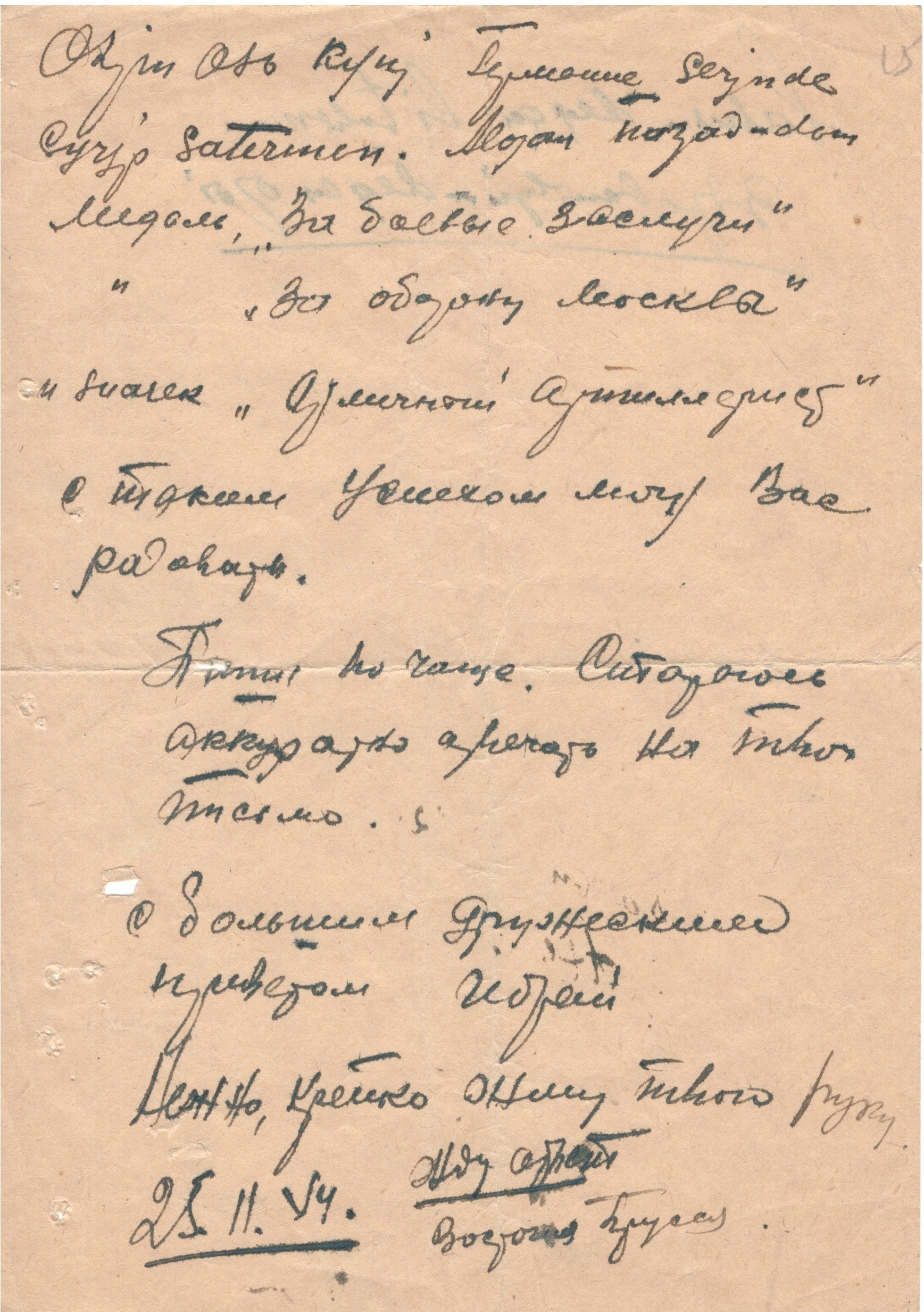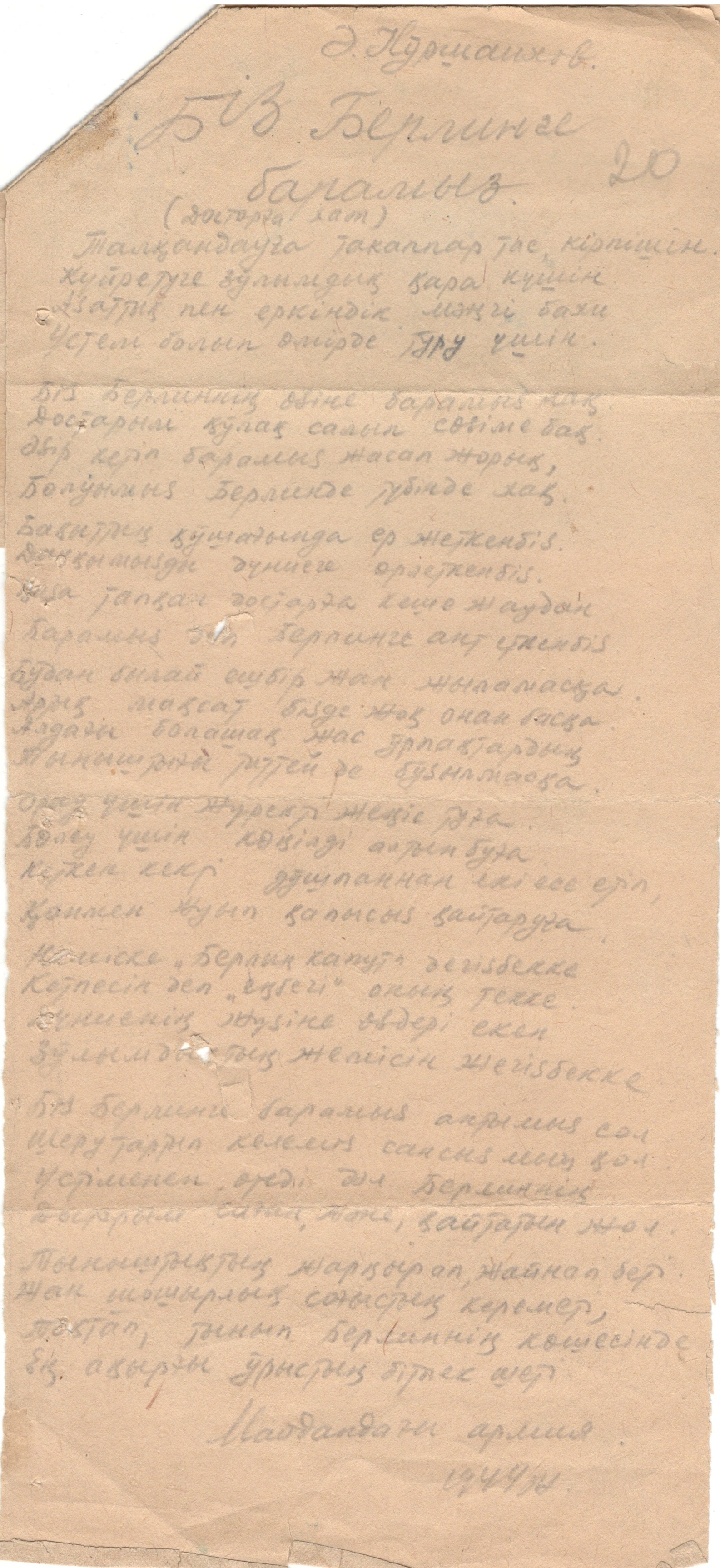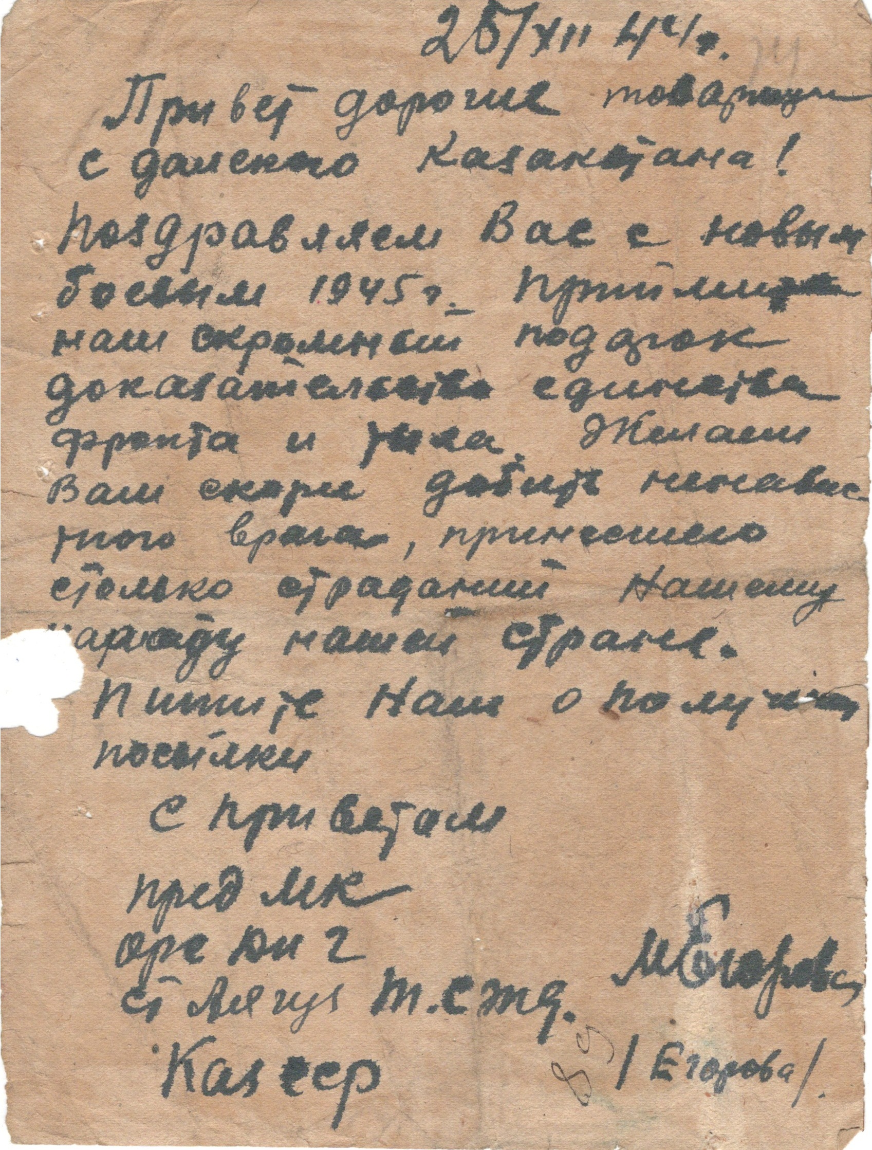 Алыстағы Қазақстаннан келген жауынгерлерге жаңа жылдық құттықтау 25.12.1944 ж. / Новогоднее поздравление бойцам из далекого Казахстана. 25.12.1944 г.