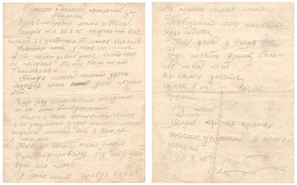 Германиядан келген белгісіз қызыл әскердің хаты. 20.02.1945 ж. / Письмо неизвестного красноармейца из Германии. 20.02.1945 г.
