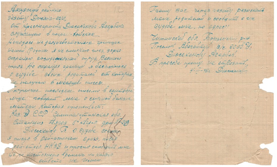 Қызыл әскер А.Дуйсекеновтің «Жаңа-Ауыл» редакциясына хаты / Письмо в редакцию газеты «Жана-Аул» красноармейца Дюсекенова А.