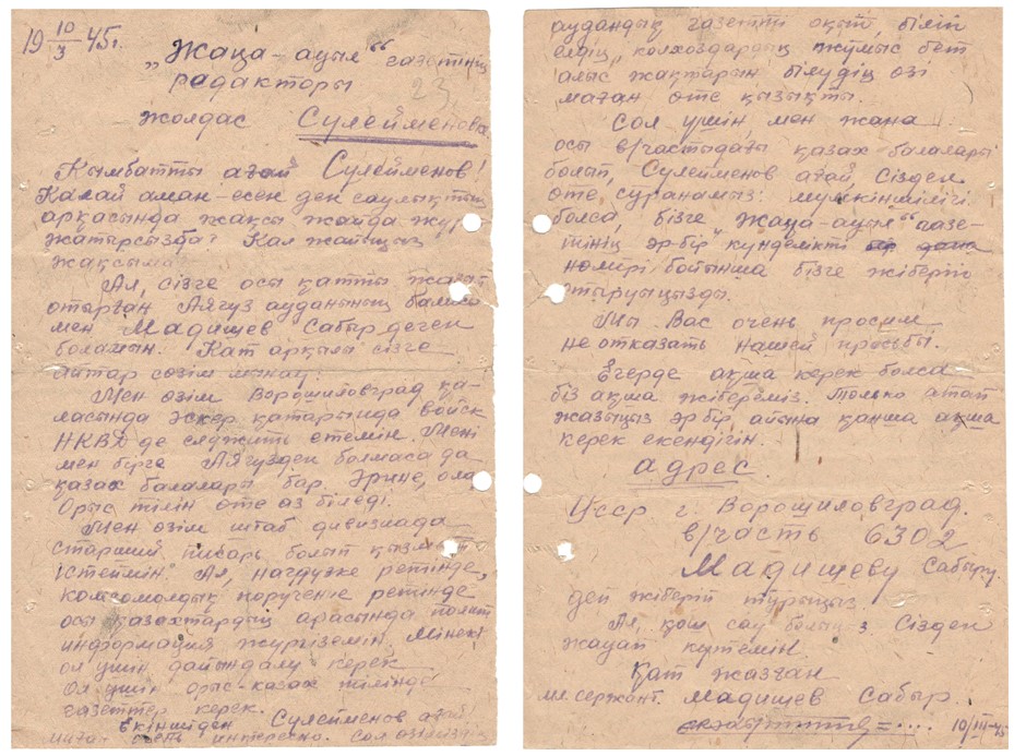 Кіші сержант С.Мадишевтің хаты «Жаңа Ауыл» газетінің редакторы Сүлейменовке. / Письмо младшего сержанта Мадишева С. редактору газеты «Жана-Аул» Сулейменову.