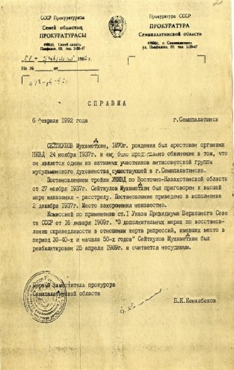 Семей облыстық прокуратурасының Мұхамедхан Сейітқұловты тұтқынға алу және актау жөніндегі анықтамасы, Семей қ., 1992 ж.
