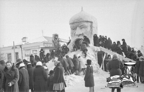Ледяная горка «Голова» с катающимися горожанами по ул. М.Калинина (ныне ул.М.Дулатова),1957 год.