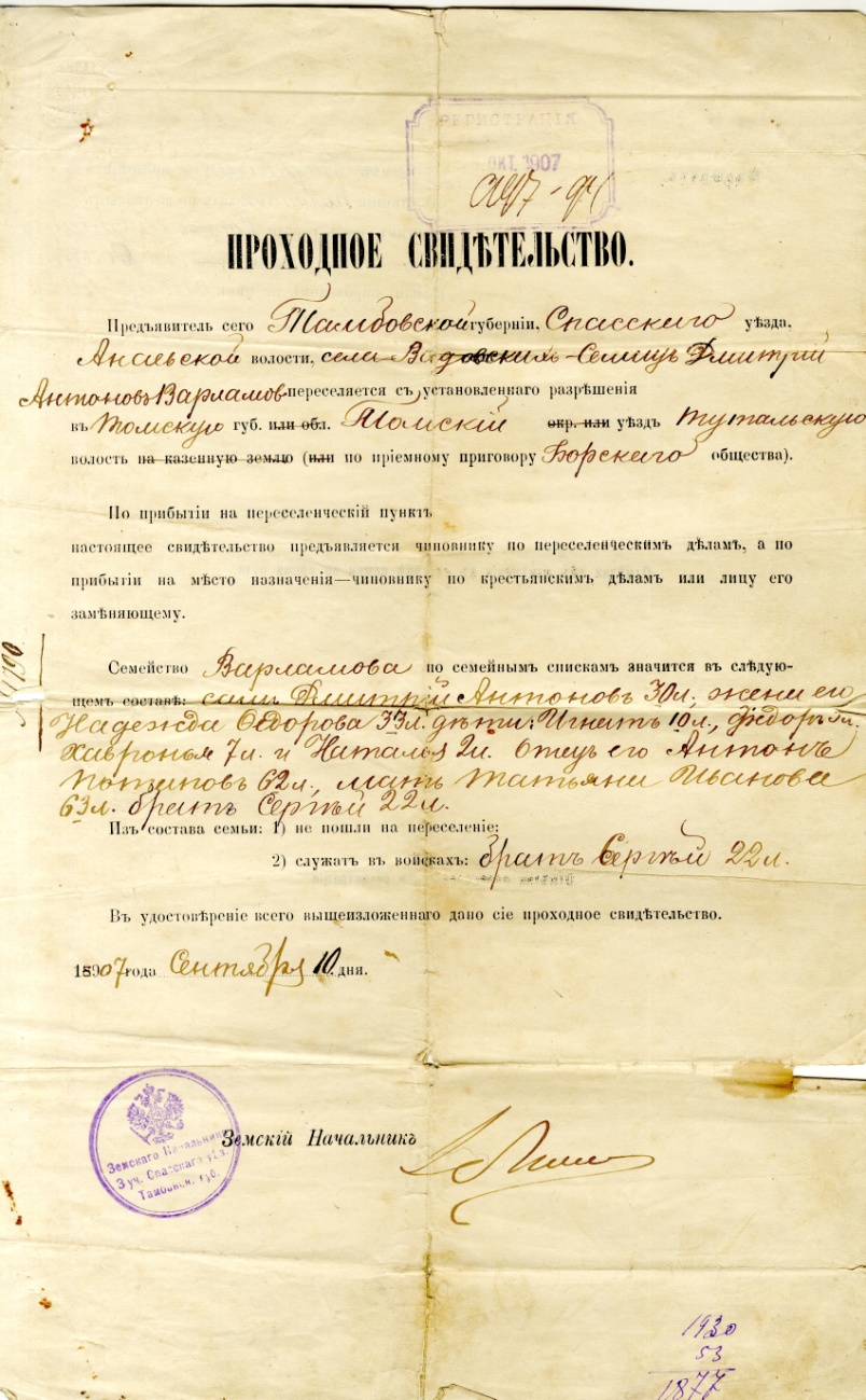 Проходное свидетельство Варламова Дмитрия Антоновича на переселение из Спасской волости Тамбовской губернии в Тутальскую волость Томской губернии. 1907 год