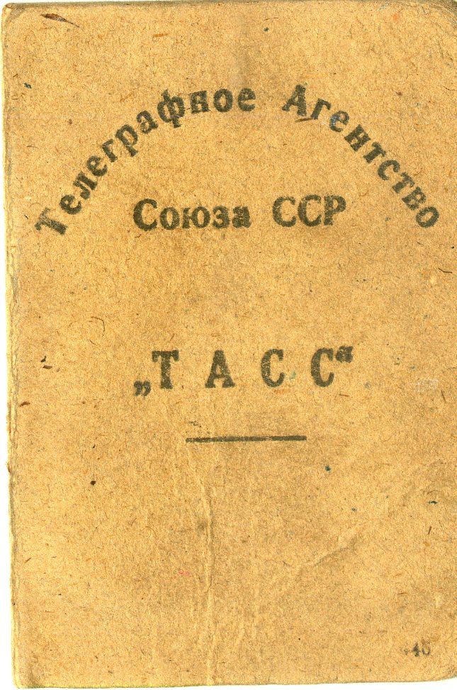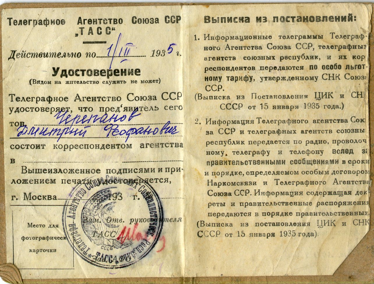 Удостоверение Черепанова Дмитрия Феофановича, корреспондента Телеграфного Агентства Союза ССР. 1935 год
