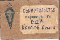 Свидетельство парашютиста Красной Армии, выданное 22 августа 1943 года, хранится в личном фонде Михаила Михайловича Беляева, ветерана Великой Отечественной войны, члена Союза художников Казахской ССР. Михаил Михайлович воевал в составе 8-й воздушно-десантной бригады 332-го стрелкового полка 104-й стрелковой дивизии 38-го стрелкового корпуса 8-й армии