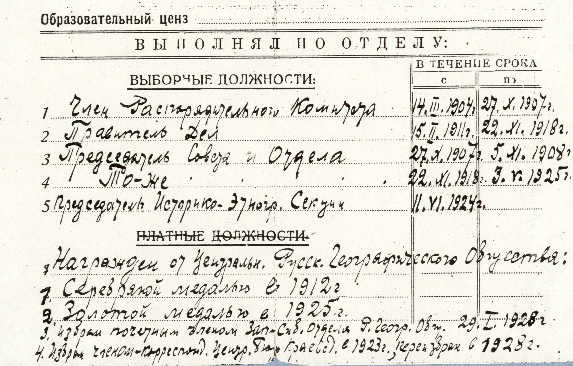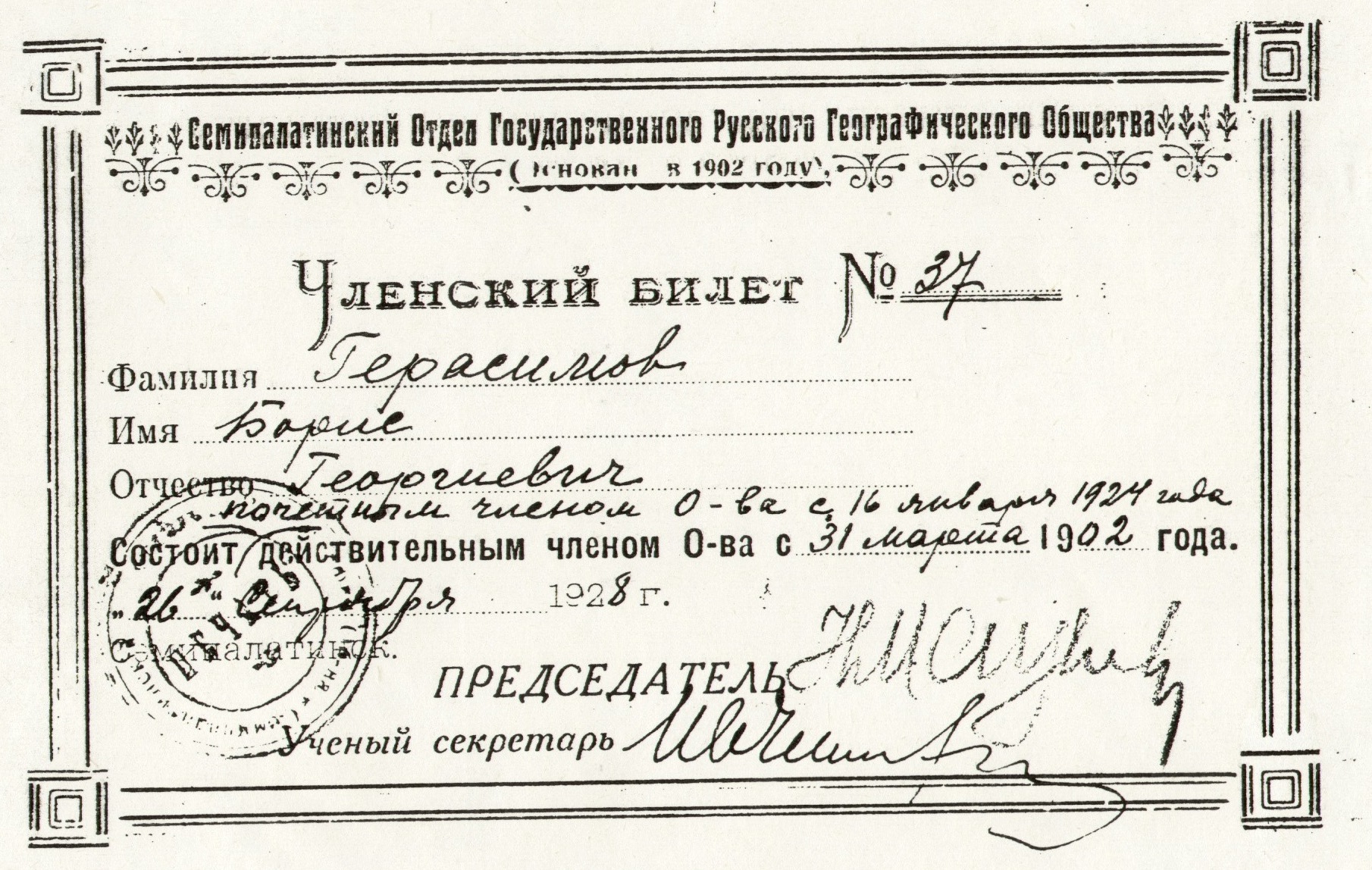Членский билет Герасимова Бориса Георгиевича, почетного члена Семипалатинского отдела Государственного Русского Географического общества, 1928 г.